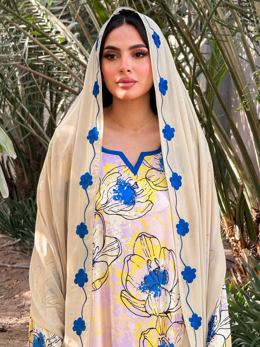 MEI675 - Yellow Floral Embroidered Jalabiya with Headscarf