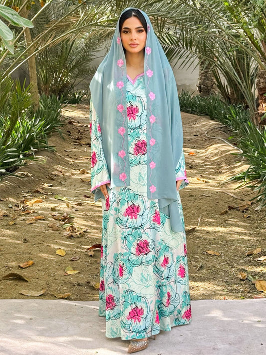 MEI674 - Turquoise Floral Embroidered Jalabiya with Headscarf