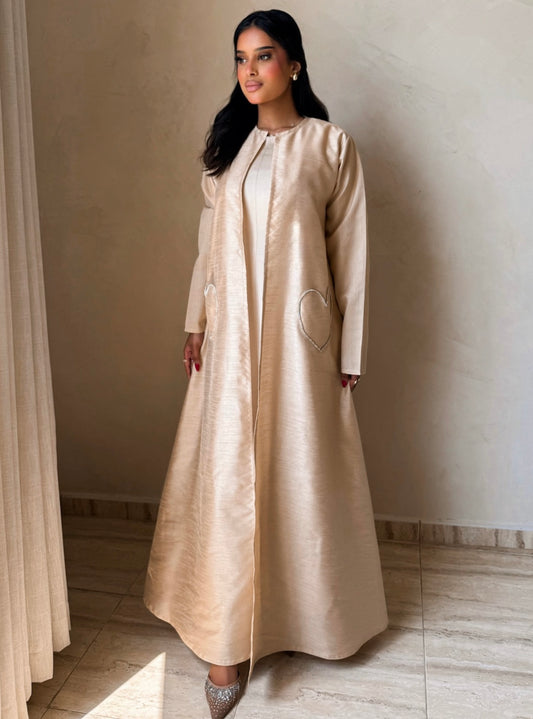 MEI724 - Beige A-Cut Taffeta & Crystals Abaya with Headscarf
