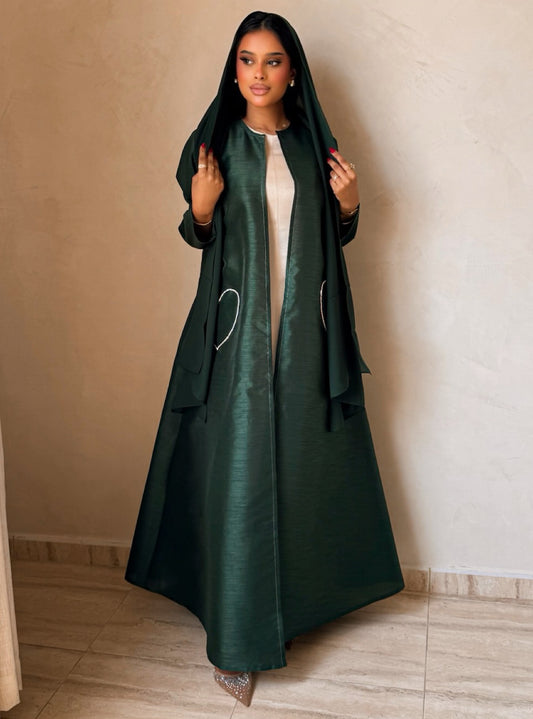 MEI726 - Green A-Cut Taffeta & Crystals Abaya with Headscarf