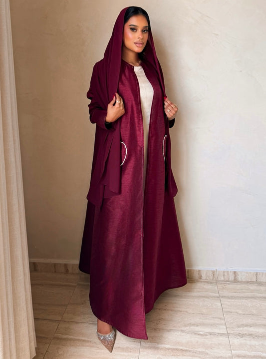 MEI730 - Maroon A-Cut Taffeta & Crystals Abaya with Headscarf