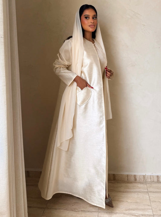 MEI728 - Off White A-Cut Taffeta & Crystals Abaya with Headscarf
