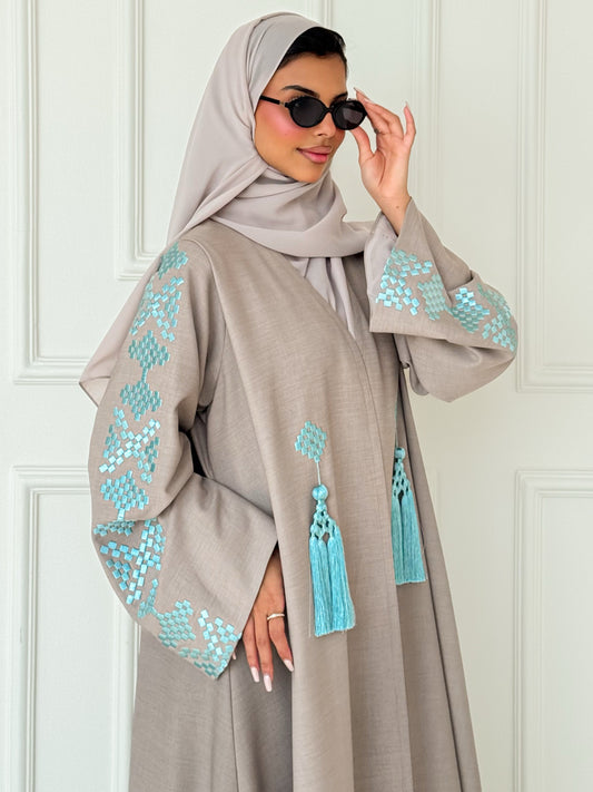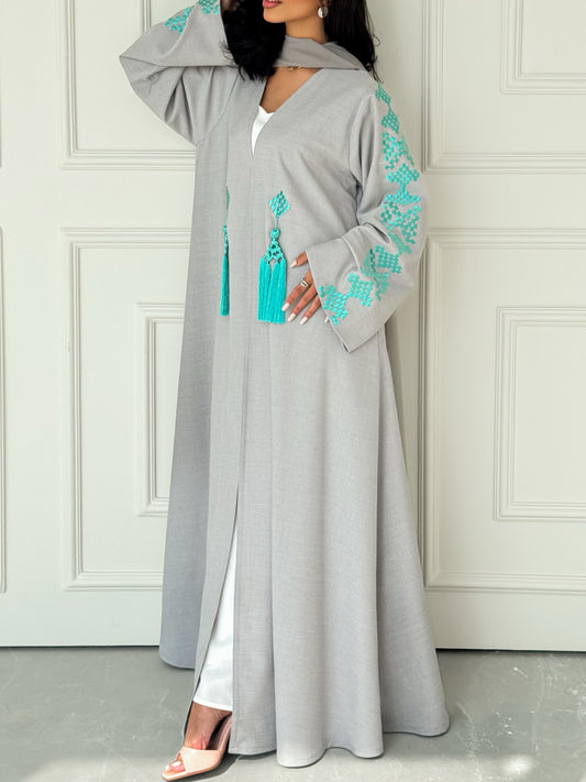 MEI619 - Grey Abaya with Turquoise Embroidery