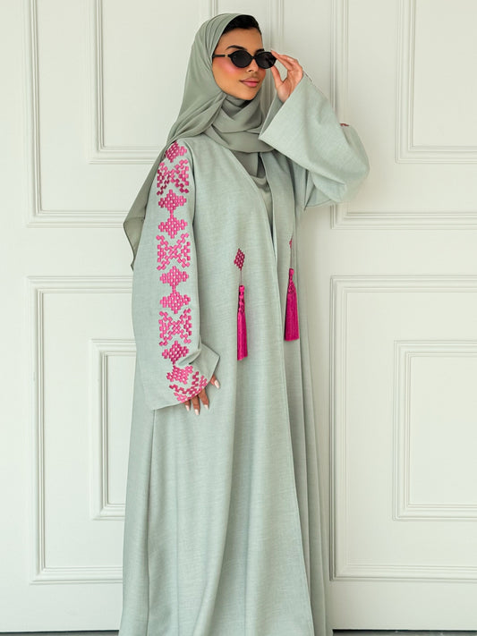 MEI623 - Light Green Abaya with Pink Embroidery