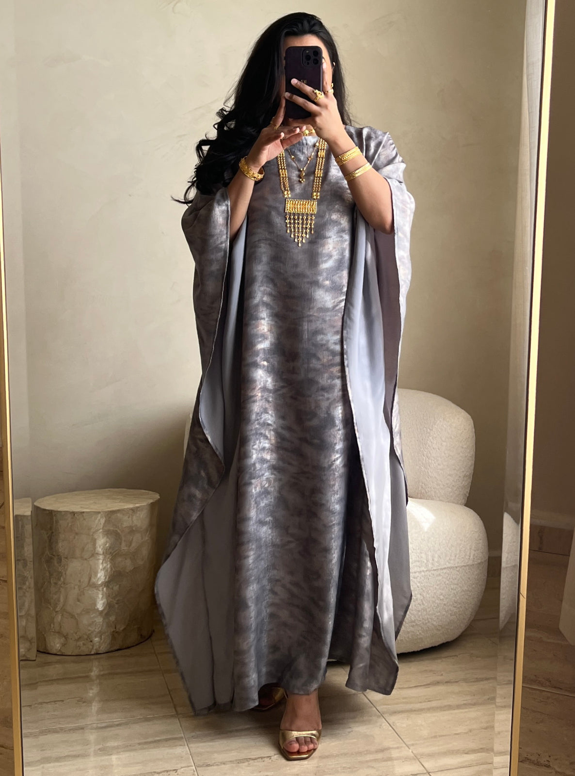Elevate your look with the elegant jalabiya, featuring a rich abstract print. Can be worn with or without the belt.