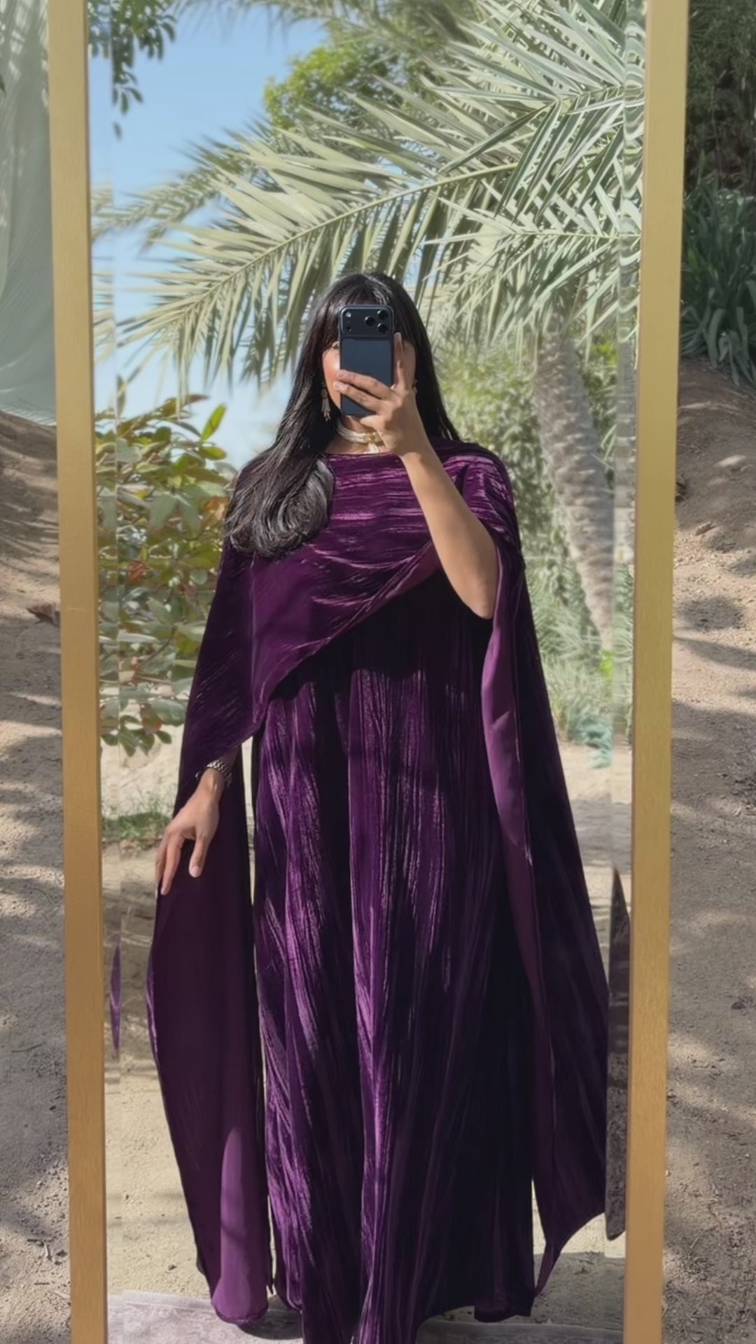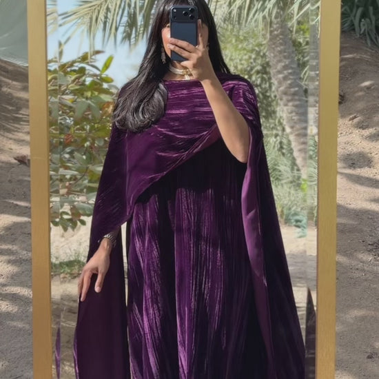 The Lilah dress features a flowing silhouette with an attached cape overlay, crafted from pleated velvet for a refined, elegant finish.