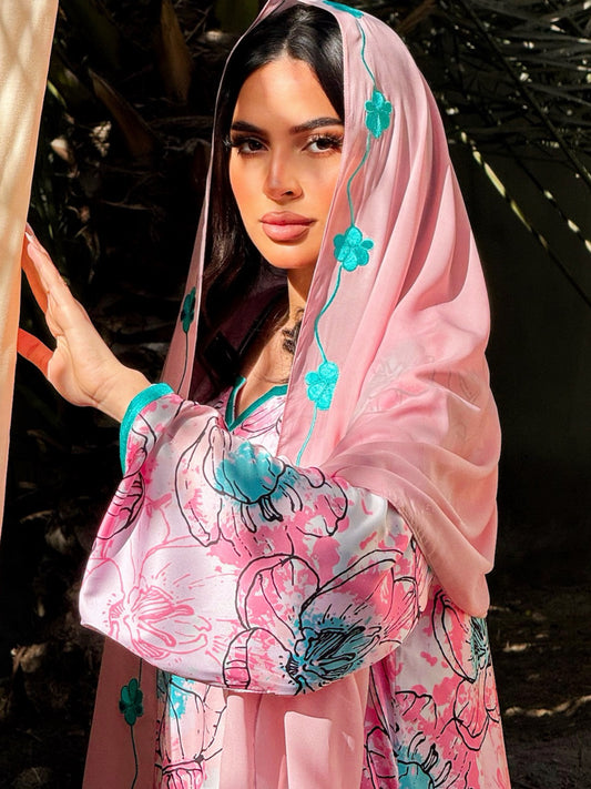 MEI673 - Pink Floral Embroidered Jalabiya with Headscarf